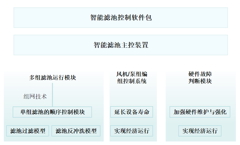 基于濾池結(jié)構(gòu)、進(jìn)水流量、進(jìn)出水水質(zhì)、運(yùn)行時(shí)間、水頭損失等數(shù)據(jù),構(gòu)建濾池過濾模型;根據(jù)反沖氣量、水量、壓力、時(shí)間等構(gòu)建濾池反沖洗模型;通過模型計(jì)算,構(gòu)建最佳的濾池運(yùn)行和反沖洗方法,由此構(gòu)成單組濾池的順序控制策略;通過組網(wǎng)技術(shù)實(shí)現(xiàn)多組濾池的過濾和反洗過程的智能化運(yùn)行策略;通過風(fēng)機(jī)編組控制系統(tǒng)和泵組編組控制系統(tǒng),實(shí)現(xiàn)經(jīng)濟(jì)運(yùn)行;結(jié)合各類時(shí)間的調(diào)節(jié)數(shù)據(jù)累積量作為硬件是否出現(xiàn)故障的輔助判據(jù),進(jìn)一步加強(qiáng)對硬件系統(tǒng)的維護(hù)工作、強(qiáng)化硬件可靠性。
